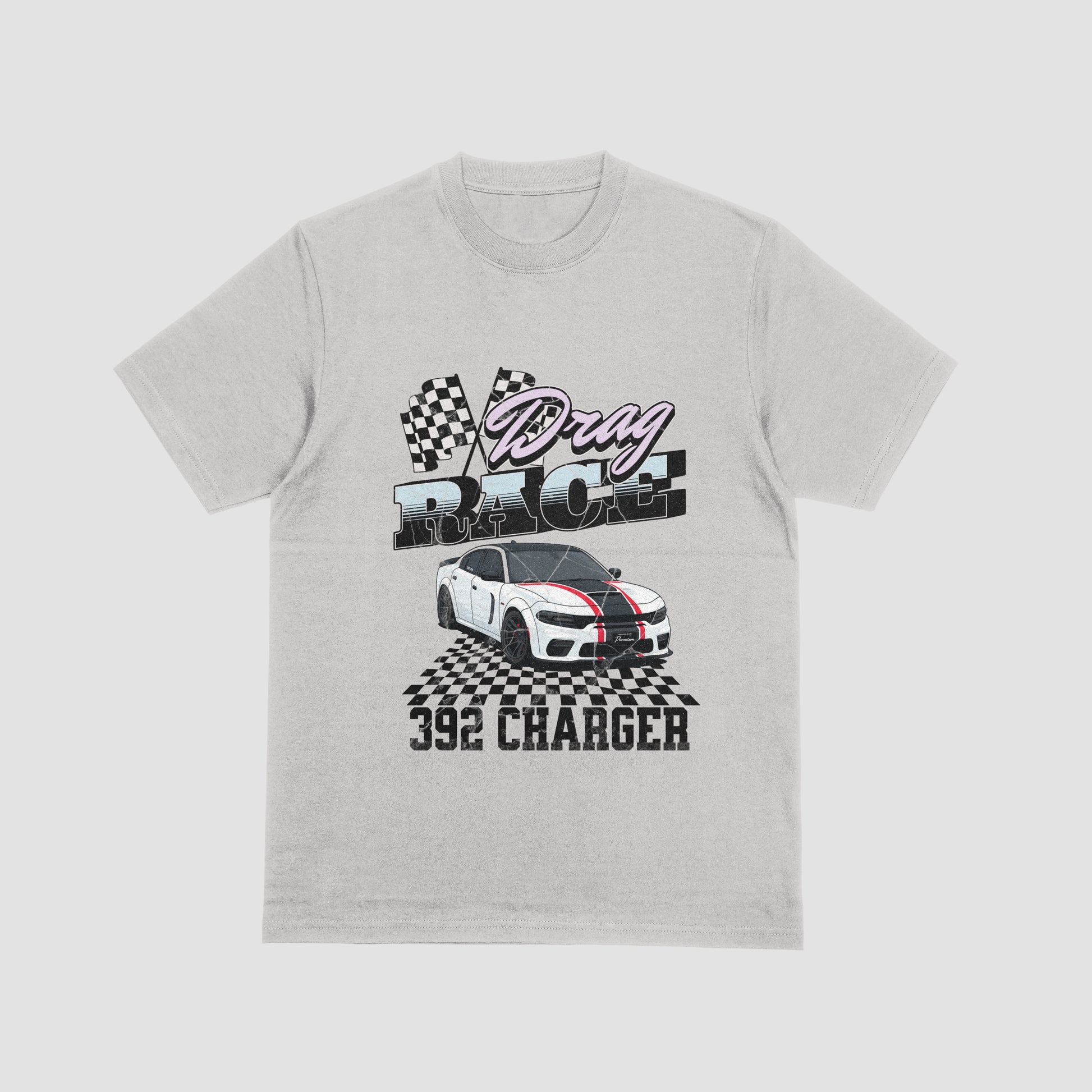 Fuel your passion for high-performance muscle with our Drag Race 392 Charger graphic tee. This eye-catching design showcases a powerful Dodge Charger 392, roaring down a checkered drag strip with dynamic "Drag Race" and “392 Charger” typography that brings speed and style front and center. Complete with racing flags and bold colors, this shirt is made for those who live life in the fast lane.